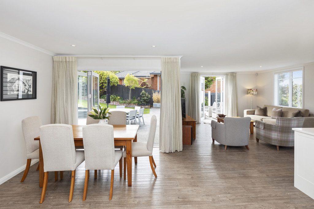 Inside, light filters through French doors and generous windows, creating a bright, restful atmosphere. The open-plan kitchen and living area are the heart of the home — a beautifully detailed space where shaker-style cabinetry, subway tiling, and engineered timber flooring combine for a warm yet contemporary feel. A large island anchors the kitchen, ideal for family gatherings or entertaining, while multiple outdoor connections extend the living space to the sunny patios and lawn beyond.