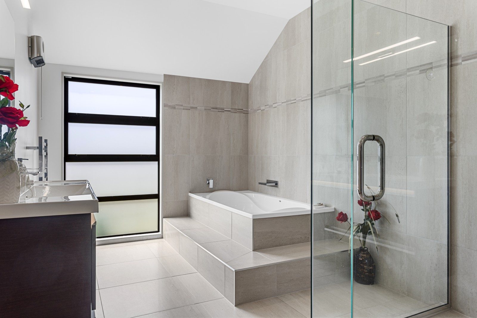 Inside, high vaulted ceilings and generous glazing bring light and openness to the home. The kitchen sits at its heart, finished with textured tiles, stone benchtops, and soft timber detailing that balance the strength of the architecture with a natural touch. A double-sided fireplace anchors the living zones, offering warmth and visual connection throughout.